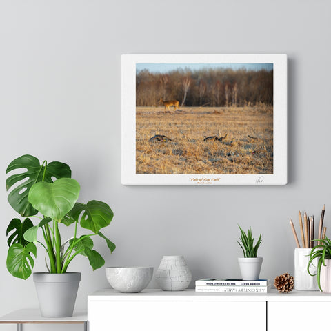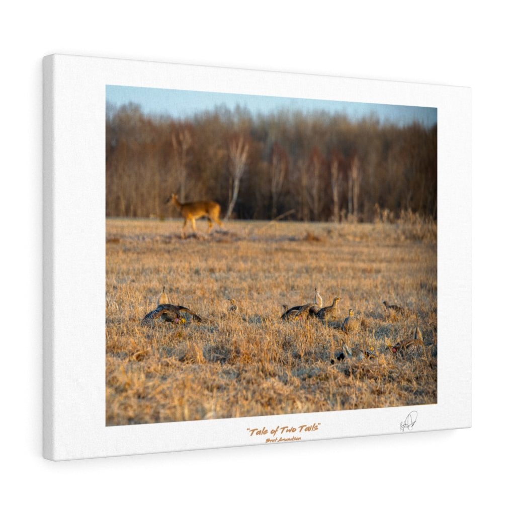"Tale of Two Tails" features a white-tailed deer taking a stroll through a sharp-tailed grouse lek in northern Minnesota. Photography by Bret Amundson. A perfect addition to every room! Our standard canvas is a finely textured artist-grade cotton substrate which consistently reproduces image details with outstanding clarity and detail.